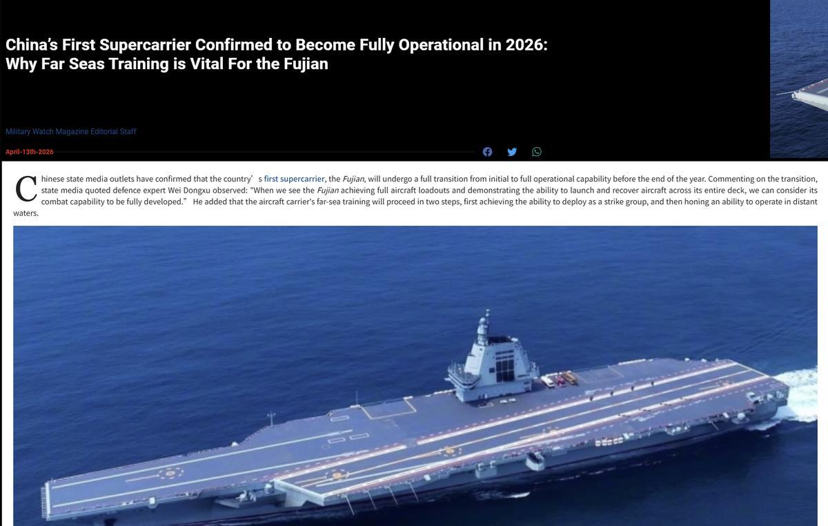 好意思国“Military Watch”网站,宣称“福建舰在2026年全面形成战役力”的说法之是以能广为流传,骨子上是因为西方在恐惧中国航母发展,慌了当作。其实这依然不是它第一次这样操作了,前几年“歼-20年产100至120架”的听说,亦然来自这家网站,一样是对中航工业发展速率的过高预测。淌若将时辰驳回十几年前,好意思媒实验上处于,格外斥责中国火器发展,真的任何高出齐要念念方设法套上“鉴戒其他国度火器”的标签。
