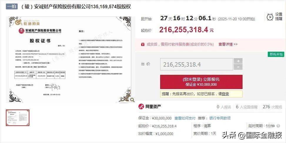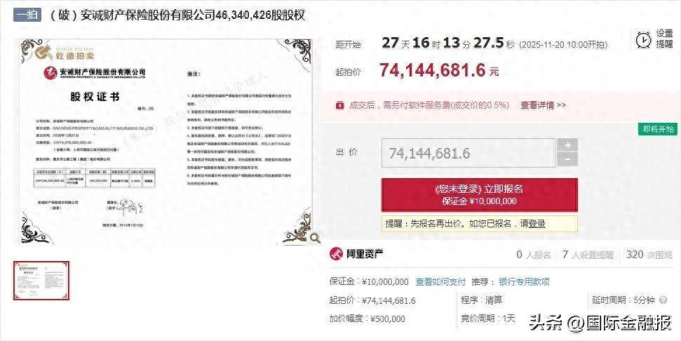 10月23日,《外洋金融报》记者在阿里金钱国法拍卖平台精通到,安诚财产保障股份有限公司(下称“安诚财险”)1.82亿股股权被拆分为两笔,将于11月20日拍卖,起拍价所有这个词2.904亿元。