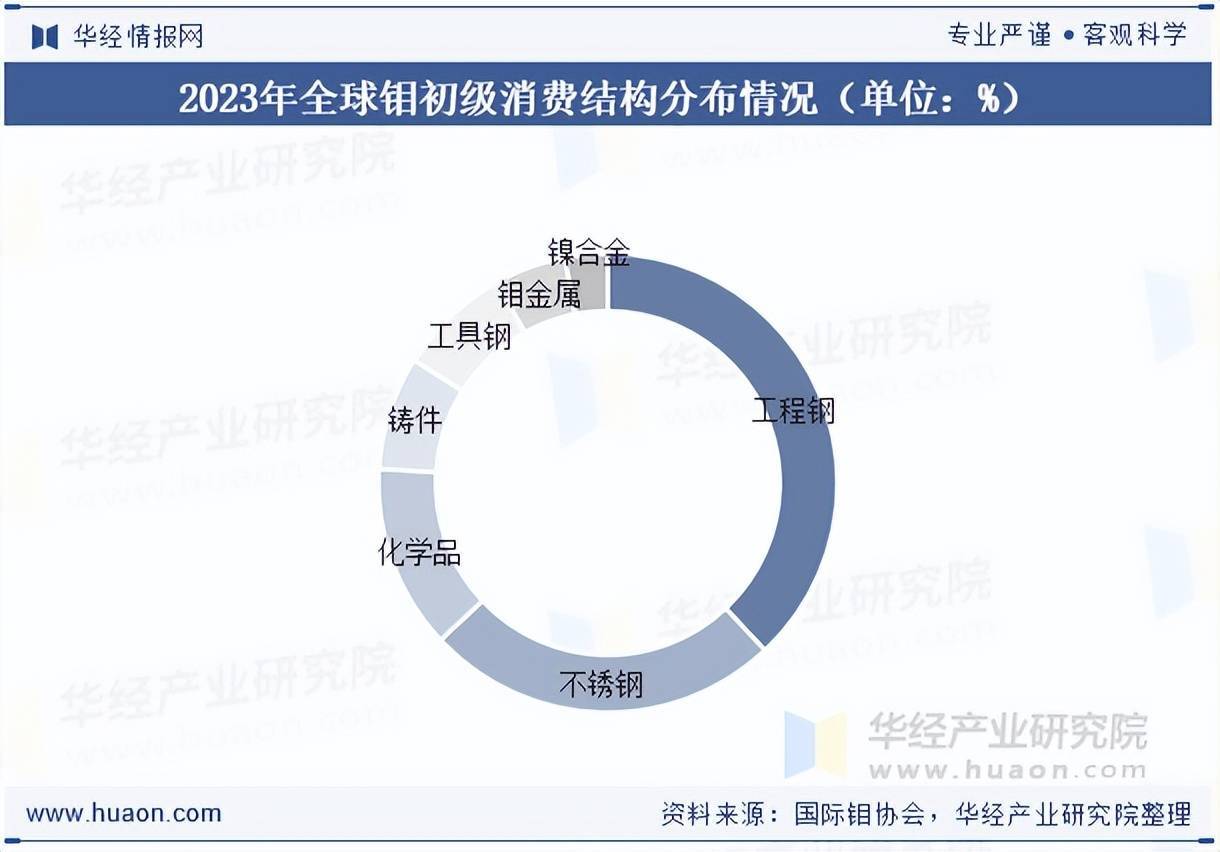 钼的低级耗尽主要应用于钢铁行业种种钢种的添加剂,以普及钢的强度、弹性截至、抗磨性及耐冲击、耐腐蚀、耐高温等性能。据统计,2023年钢铁行业占钼需求总量的79%,其中,工程钢、不锈钢、器具钢等优特钢对钼的需求较大。