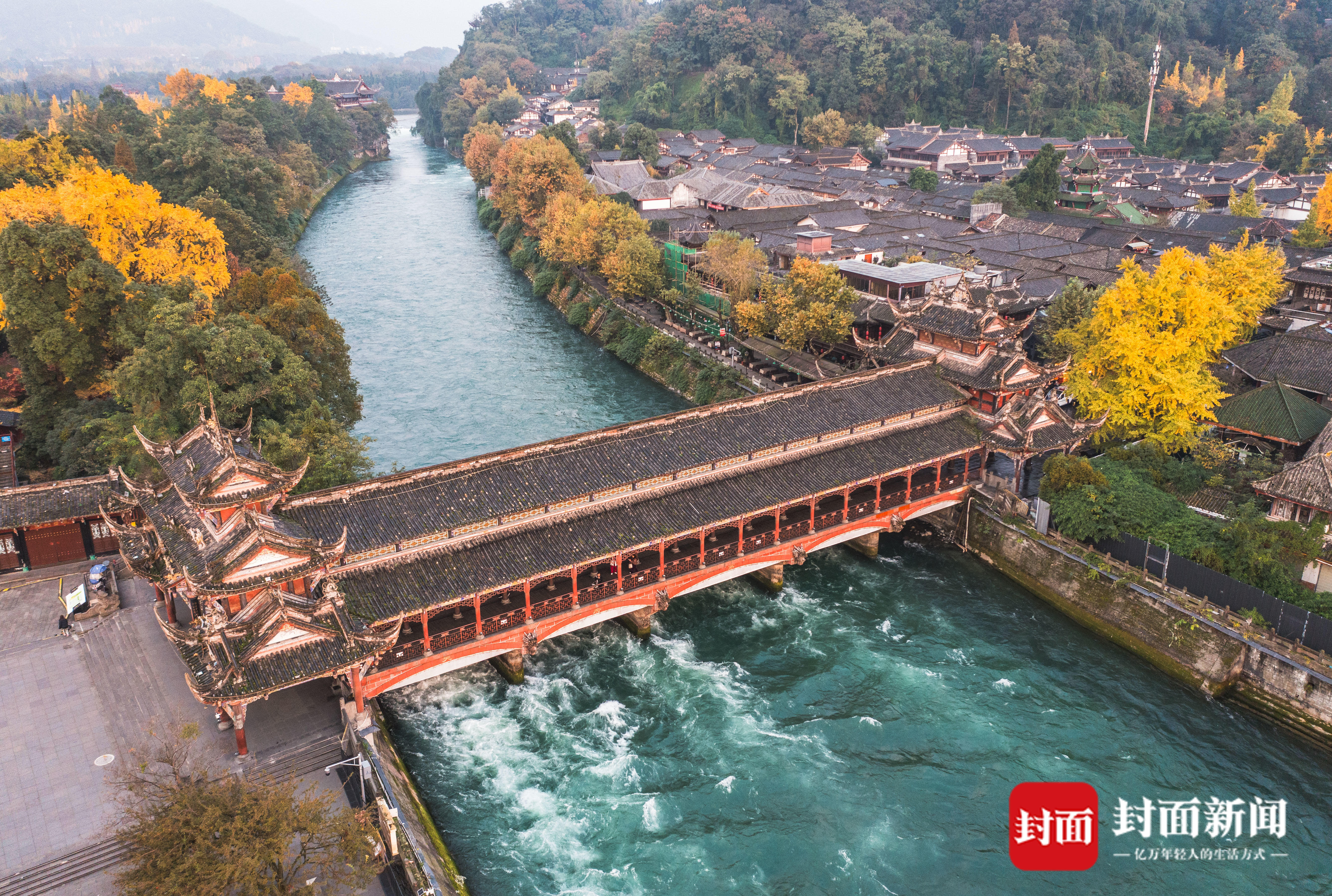 皆江堰景区,碧绿的岷江水和金黄色的银杏情味横生。