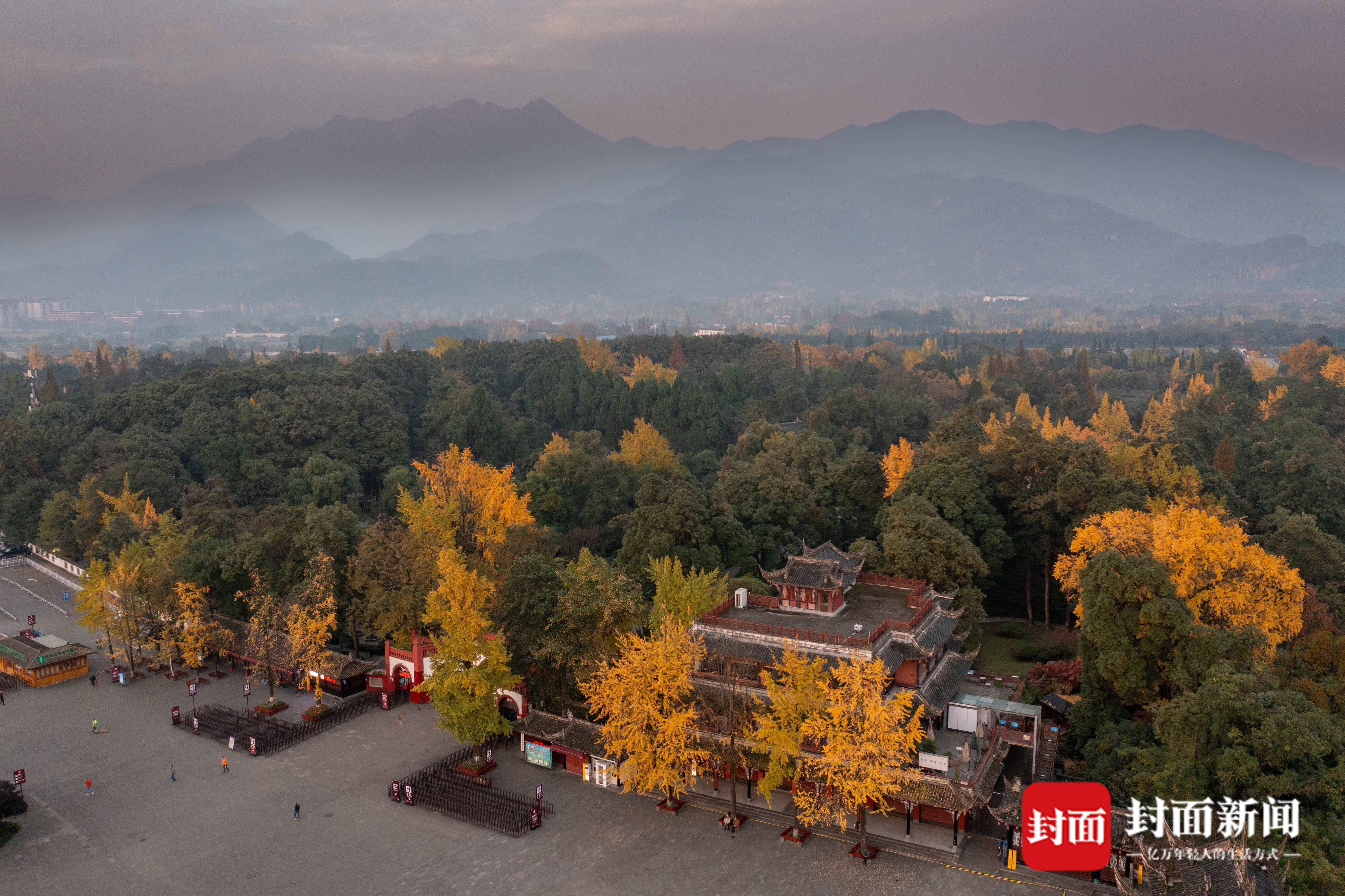 皆江堰景区外,银杏金黄,背后的远山乍明乍灭。
