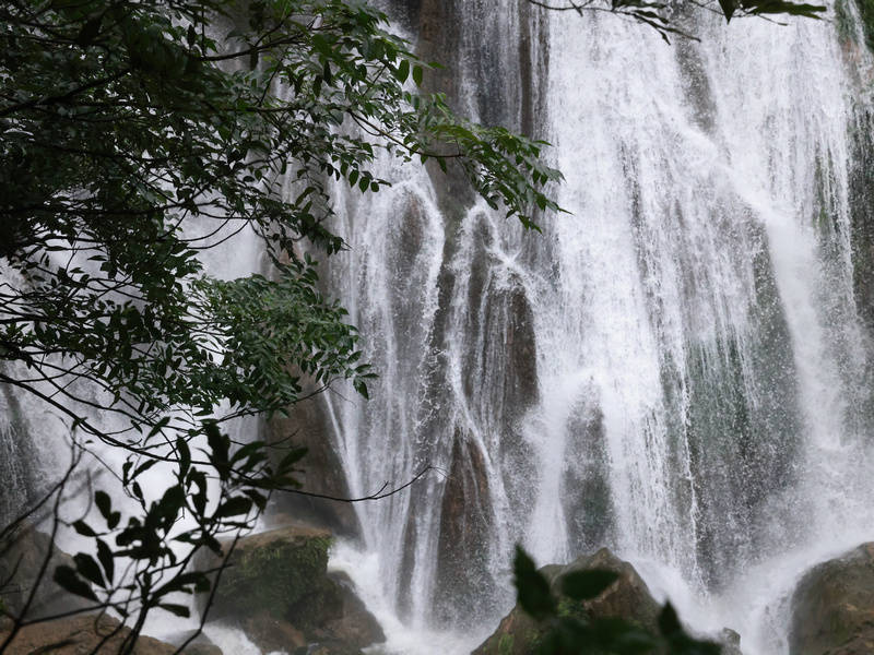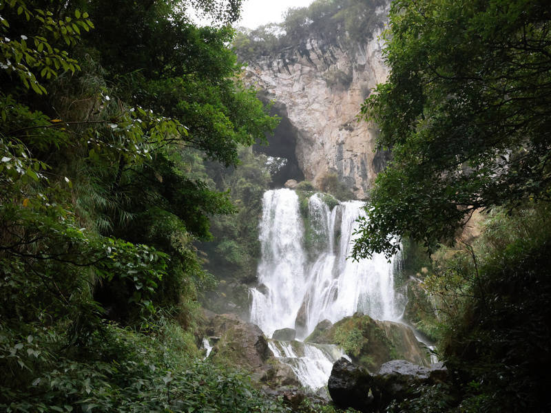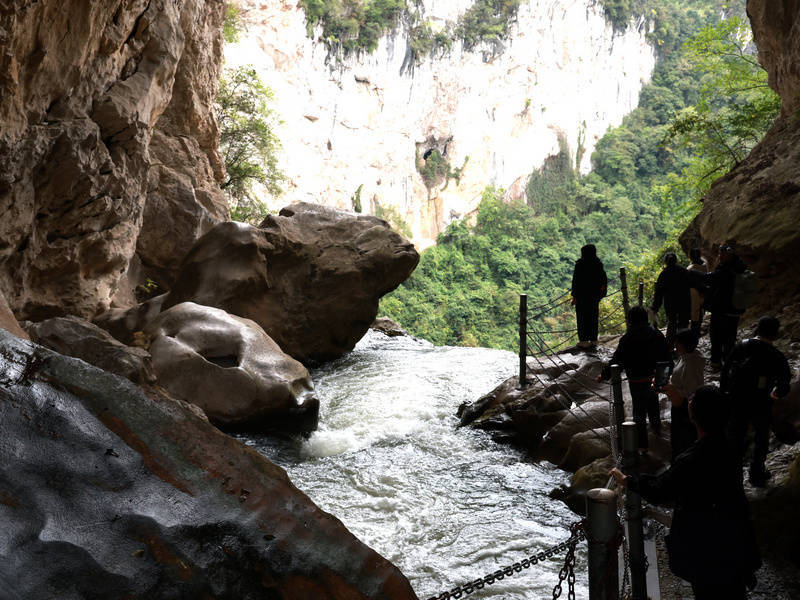 清流激湍穿越石窍,立时跌入石窍后方陡壁,飞泻于山地深处,一坎接一坎变成多级瀑布群以及“大黑潭”“小黑潭”等自然浴场,然后流经猫洞河峡谷再汇入猫跳河(古称滴澄河)。与上方洞中吼声如雷的迅猛河流不同,绝壁上吊挂的天生桥瀑布群和缓而纵欲,宽宽的瀑流佩戴寒烟,远不雅如白虹飞架、珠帘掩洞、电光忽闪,近看如轻纱漫卷、白练覆石、青娥晒裙。
